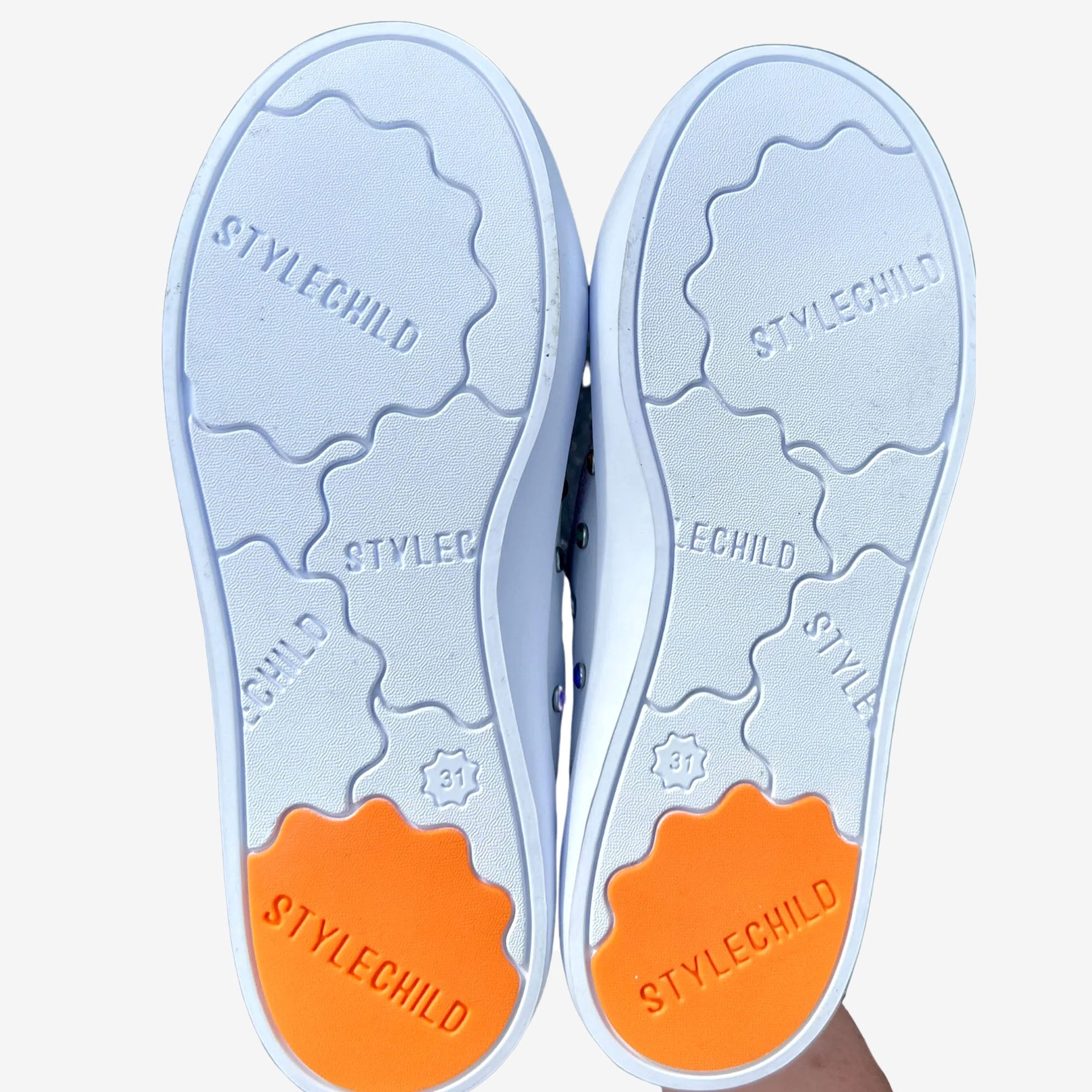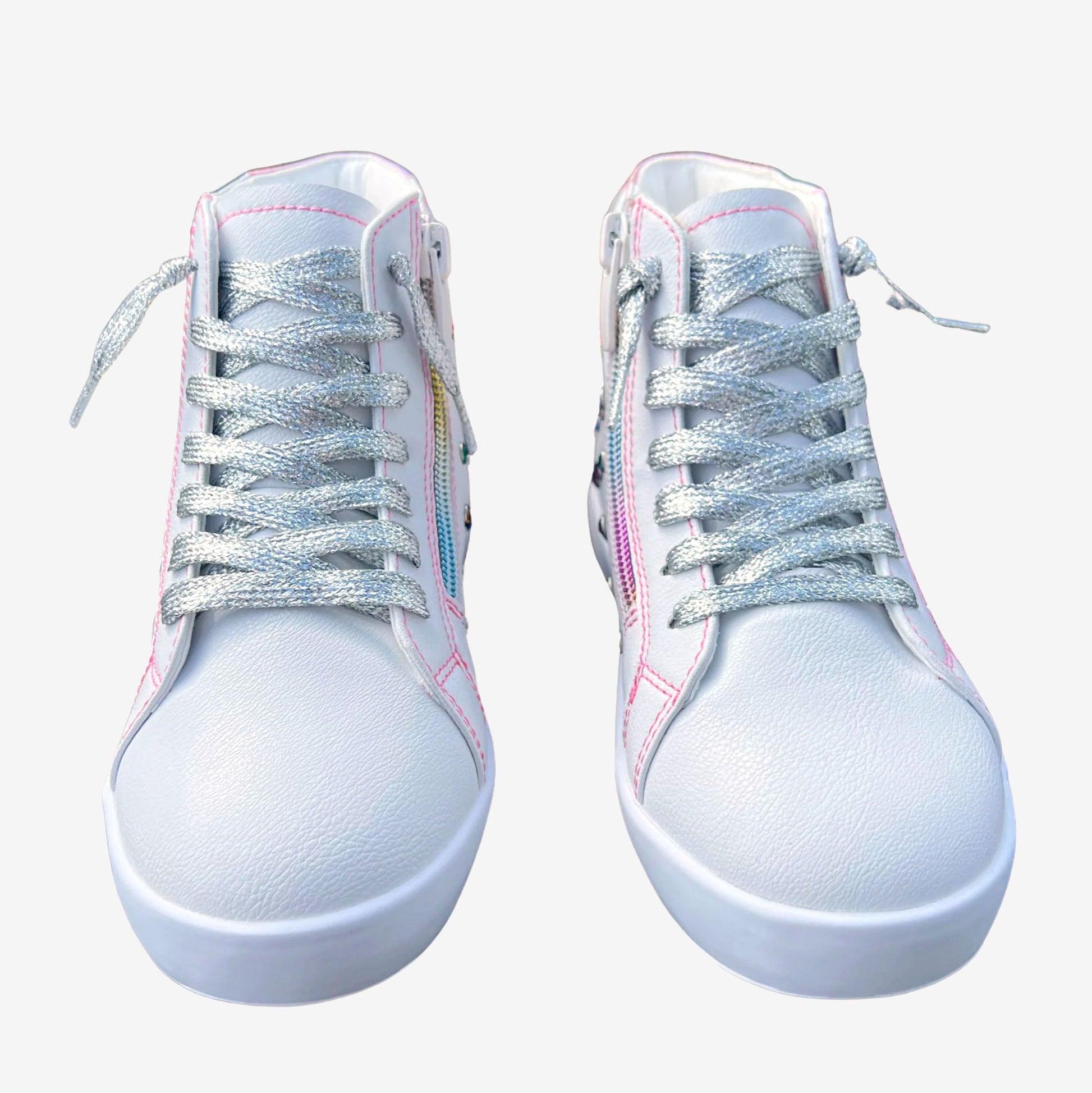 These white high-top sneakers are made from vegan leather and feature playful pink stitching. Bright rainbow studs add a lively, trendy touch, while vibrant multi-color ombre zippers ensure easy wear with a standout look. Metallic silver laces are adjustable for a customized fit, and updated branded soles and insoles provide enhanced comfort and style.